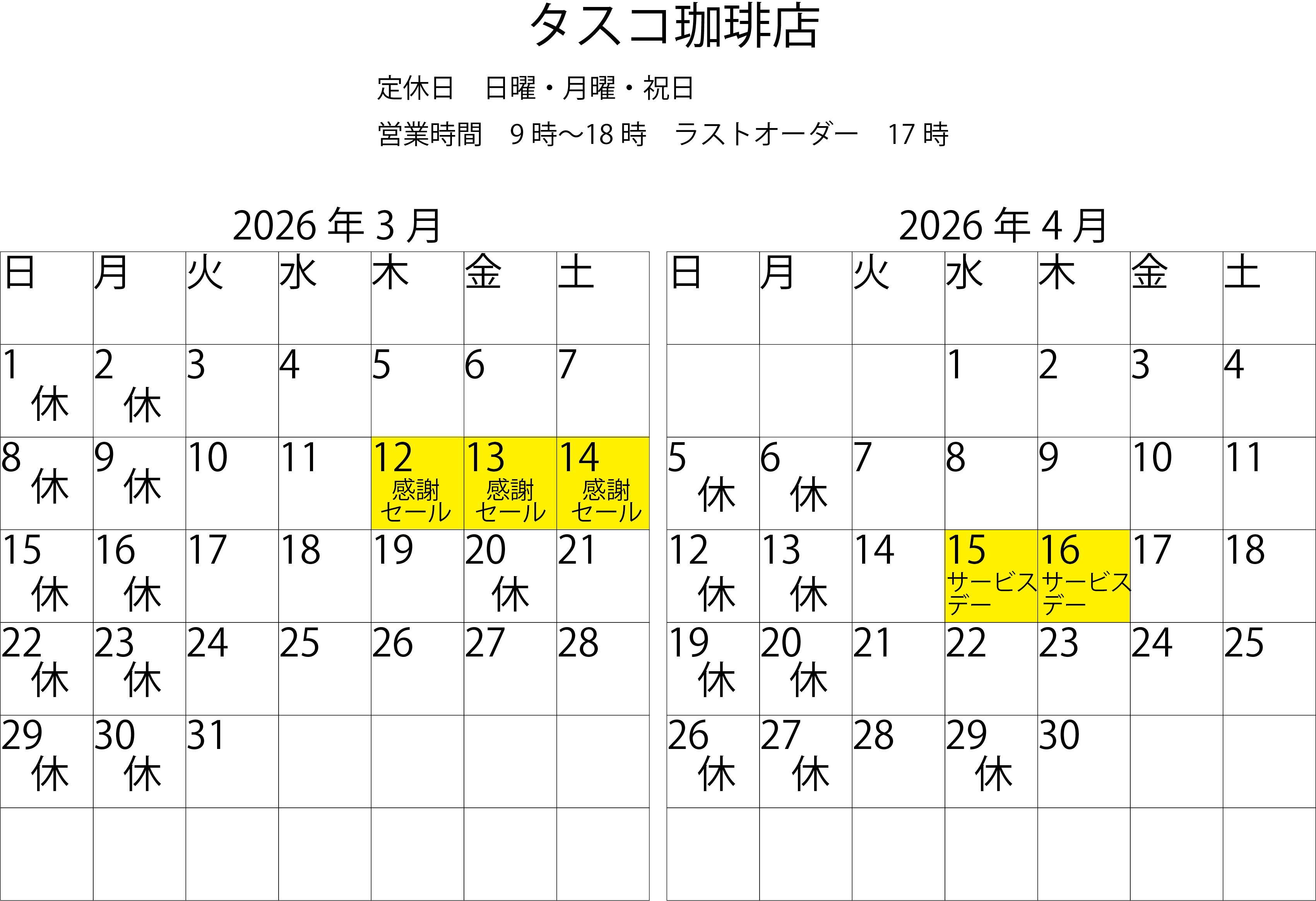 3月4月の営業日カレンダー | タスコ珈琲